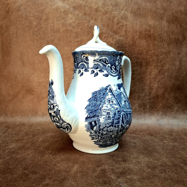 Originele Royal Tudor Ware theepot, vervaardigd in Engeland ca. 1930-1950. Uitgevoerd in klassiek blauw-wit transferdecor met landelijk tafereel, onderdeel van de duurzame ironstone-productie. De onderglazuurdruk zorgt voor kleur- en slijtvastheid. De vermelding van graveur W.N. Mellor verhoogt de verzamelwaarde. Een authentiek stuk Engelse keramiekgeschiedenis, interessant voor verzamelaars van transferware en Brits servies.