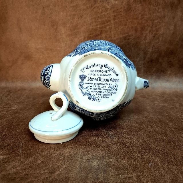 Original Royal Tudor Ware teapot, made in England circa 1930-1950. Decorated in classic blue and white transferware with a rural scene, part of the durable ironstone production. The underglaze printing ensures lasting colour and wear resistance. The mention of engraver W.N. Mellor adds collector value. An authentic piece of English ceramic history, sought after by transferware and British pottery collectors.