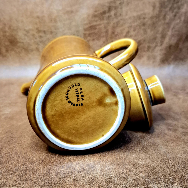 Vintage jug by Kera Vitral, produced in former Czechoslovakia (circa 1970s). The warm mustard-to-caramel glaze and slender, balanced shape are characteristic of Eastern European mid-century ceramics. Marked on the base, confirming its origin. While similar retro jugs exist with lower market value, this piece belongs to a recognizable production with authentic vintage character and collectible context.